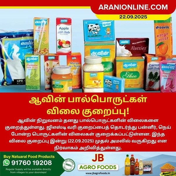 ஆவின் நிறுவனம் தனது பால்பொருட்களின் விலைகளை குறைத்துள்ளது. ஜிஎஸ்டி வரி குறைப்பைத் தொடர்ந்து பன்னீர், நெய் போன்ற பொருட்களின் விலைகள் குறைக்கப்பட்டுள்ளன. இந்த விலை குறைப்பு இன்று (22.09.2025) முதல் அமலில் வருகிறது என நிர்வாகம் அறிவித்துள்ளது.