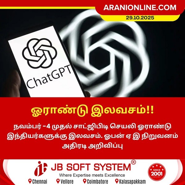 நவம்பர் – 4 முதல் சாட்ஜிபிடி செயலி ஓராண்டு இந்தியர்களுக்கு இலவசம். ஓபன் ஏ இ நிறுவனம் அதிரடி அறிவிப்பு.