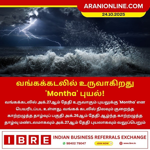 வங்கக்கடலில் அக்.27ஆம் தேதி உருவாகும் புயலுக்கு ‘Montha’ என பெயரிடப்பட உள்ளது. வங்கக் கடலில் நிலவும் குறைந்த காற்றழுத்த தாழ்வுப் பகுதி அக்.26ஆம் தேதி ஆழ்ந்த காற்றழுத்த தாழ்வு மண்டலமாகவும் அக்.27ஆம் தேதி புயலாகவும் வலுப்பெறும்