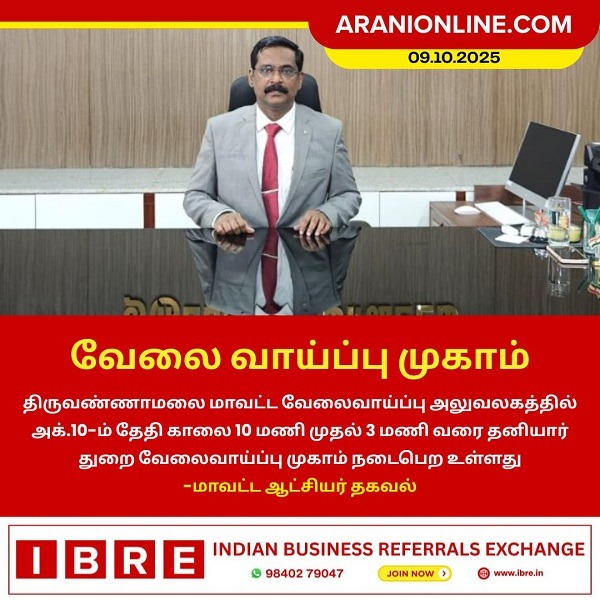 திருவண்ணாமலை மாவட்ட வேலைவாய்ப்பு அலுவலகத்தில் அக்.10-ம் தேதி காலை 10 மணி முதல் 3 மணி வரை தனியார் துறை வேலைவாய்ப்பு முகாம் நடைபெற உள்ளது – மாவட்ட ஆட்சியர் தகவல்.