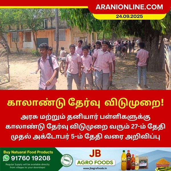 அரசு மற்றும் தனியார் பள்ளிகளுக்கு காலாண்டு தேர்வு விடுமுறை வரும் 27-ம் தேதி முதல் அக்டோபர் 5-ம் தேதி வரை அறிவிப்பு.