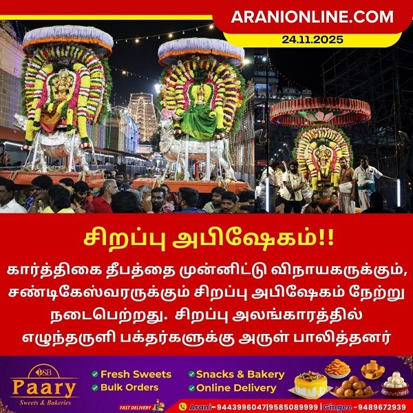 கார்த்திகை தீபத்தை முன்னிட்டு, விநாயகருக்கும் சண்டிகேஸ்வரருக்கும் நேற்று சிறப்பு அபிஷேகம் நடைபெற்றது. பின்னர், இருவரும் சிறப்பு அலங்காரத்தில் எழுந்தருளி பக்தர்களுக்கு அருள் பாலித்தனர்.