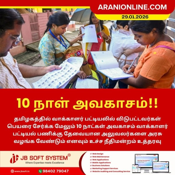 தமிழகத்தில் வாக்காளர் பட்டியலில் விடுபட்டவர்கள் பெயரை சேர்க்க மேலும் 10 நாட்கள் அவகாசம் வாக்காளர் பட்டியல் பணிக்கு தேவையான அலுவலர்களை அரசு வழங்க வேண்டும் எனவும் உச்ச நீதிமன்றம் உத்தரவு.