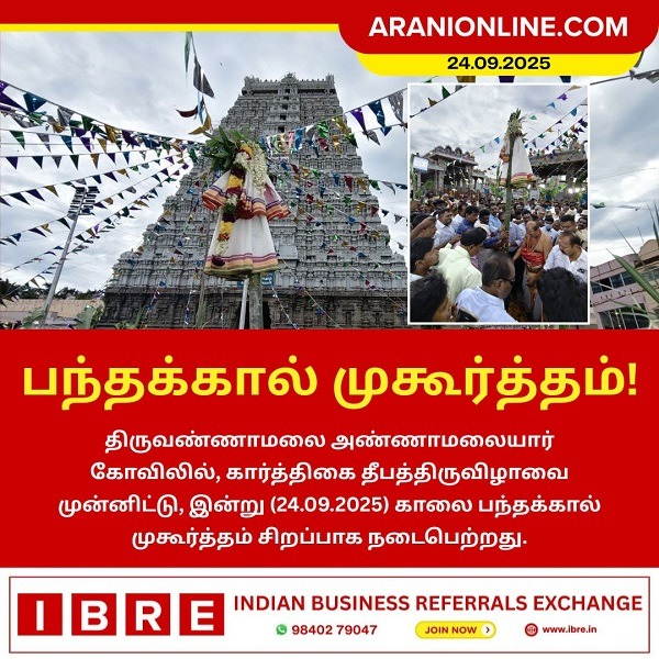 திருவண்ணாமலை அண்ணாமலையார் திருக்கோயிலில் திருக்கார்த்திகை தீபத்திருவிழாவை முன்னிட்டு இன்று (24.09.2025) காலை 6:00 மணிக்கு மேல் 7.30 மணிக்குள் ராஐகோபுரம் அருகில் பந்தக்கால் நடப்பட்டது.