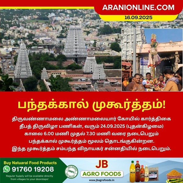 திருவண்ணாமலை அண்ணாமலையார் கோயில் கார்த்திகை தீபத் திருவிழா பணிகள், வரும் 24.09.2025 (புதன்கிழமை) காலை 6.00 மணி முதல் 7.30 மணி வரை நடைபெறும் பந்தக்கால் முகூர்த்தம் மூலம் தொடங்குகின்றன. இந்த முகூர்த்தம் சம்பந்த விநாயகர் சன்னதியில் நடைபெறும்.