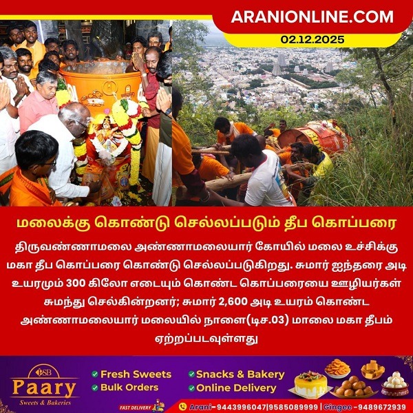 திருவண்ணாமலை அண்ணாமலையார் கோயில் மலை உச்சிக்கு மகா தீப கொப்பரை கொண்டு செல்லப்படுகிறது. சுமார் ஐந்தரை அடி உயரமும் 300 கிலோ எடையும் கொண்ட கொப்பரையை ஊழியர்கள் சுமந்து செல்கின்றனர். சுமார் 2,600 அடி உயரம் கொண்ட அண்ணாமலையார் மலையில் நாளை(டிச.03) மாலை மகா தீபம் ஏற்றப்படும்.