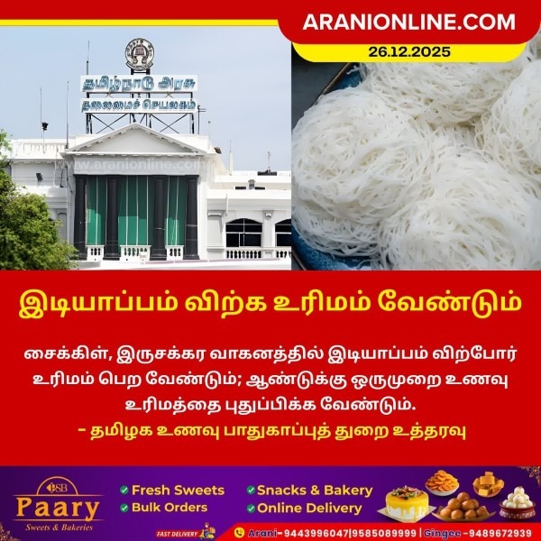சைக்கிள், இருசக்கர வாகனத்தில் இடியாப்பம் விற்போர் உரிமம் பெற வேண்டும்; ஆண்டுக்கு ஒருமுறை உணவு உரிமத்தை புதுப்பிக்க வேண்டும் – தமிழக உணவு பாதுகாப்புத் துறை உத்தரவு