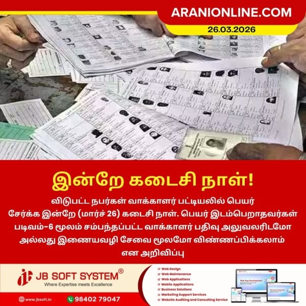 விடுபட்ட நபர்கள் வாக்காளர் பட்டியலில் பெயர் சேர்க்க இன்றே (மார்ச் 26) கடைசி நாள். பெயர் இடம்பெறாதவர்கள் படிவம்-6 மூலம் சம்பந்தப்பட்ட வாக்காளர் பதிவு அலுவலரிடமோ அல்லது இணையவழி சேவை மூலமோ விண்ணப்பிக்கலாம்.